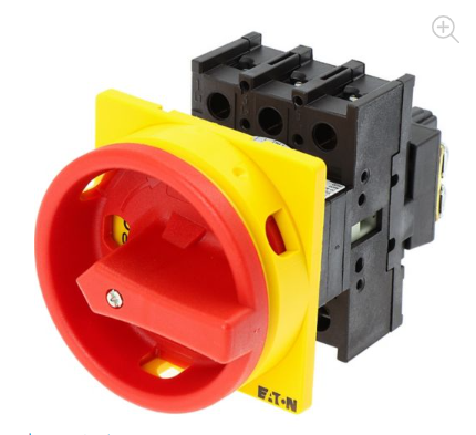 Interruptor principal Eaton Moeller® serie P1, P1, 25 A, montaje empotrado, 3 polos, función de apagado de emergencia, con maneta giratoria roja y anillo de bloqueo amarillo, bloqueable en la posición 0 (apagado)